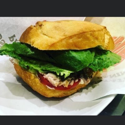 Panino di semola con Porchetta al forno, provola affumicata, pomodoro, salsa Worcestershire, salsa BBQ (Semolana sandwich with roast pork, smoked provola, tomato, Worcestershire sauce, BBQ sauce)