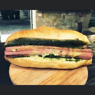 (Semolina sandwich with 20 cm sicilian pork and calf wurstel, pesto of “Sinapi”, orange mustarde sauce)